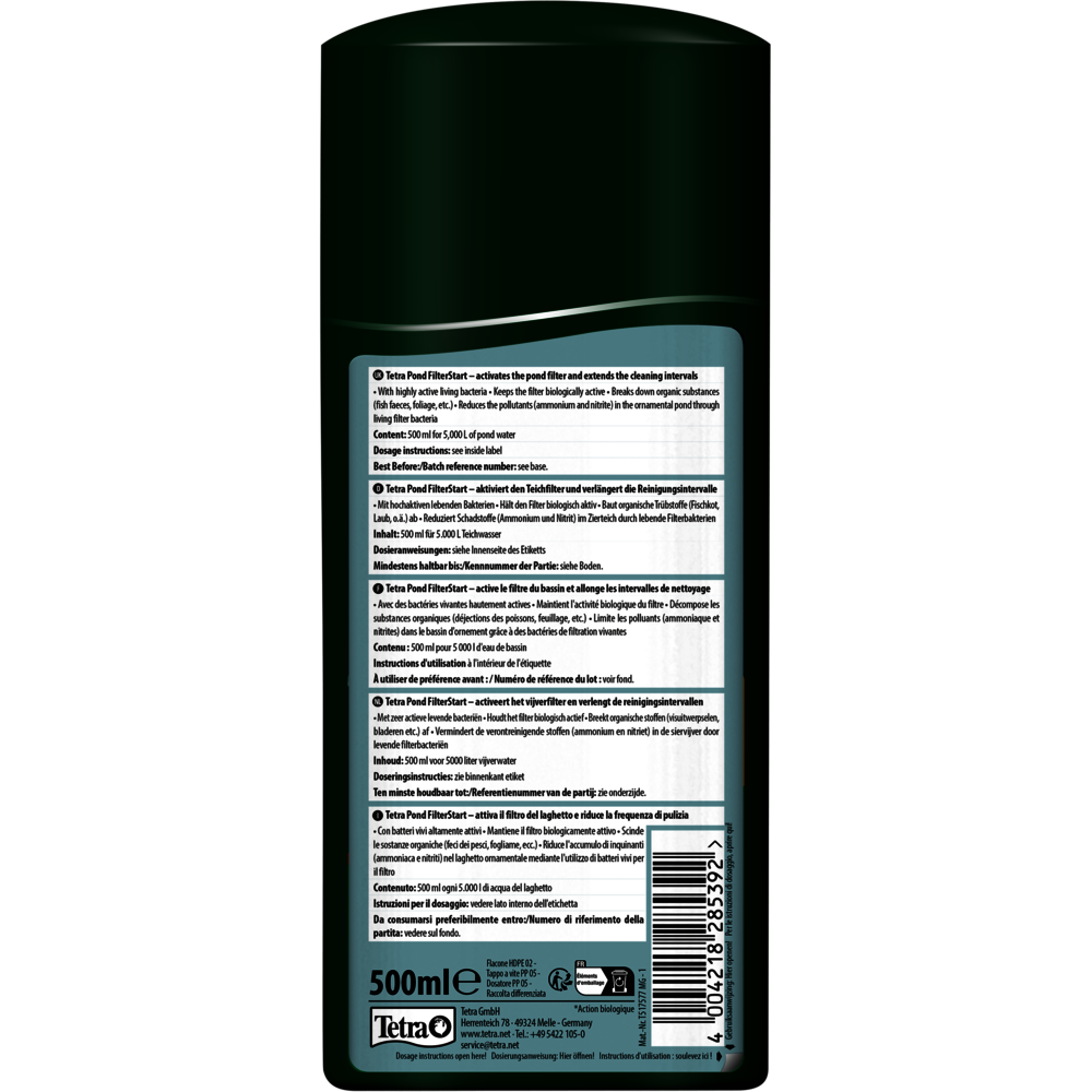 Tetra Pond FilterStart має суто біологічну дію, яка гарантує, що фільтр відновить свою повну продуктивність всього за кілька днів, наприклад, після очищення фільтра, перезапуску, особливо на початку весняного сезону або після лікування.