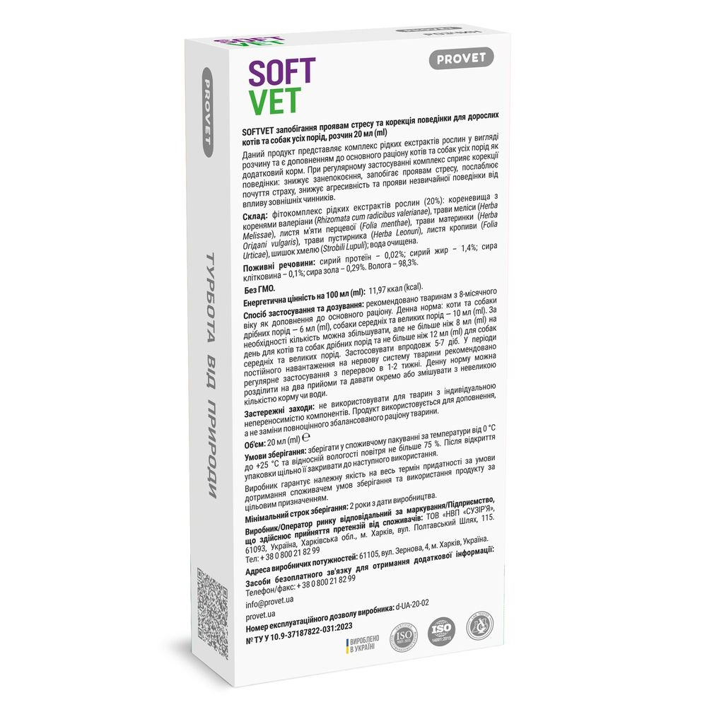 Склад: фітокомплекс рідких екстрактів рослин (20 %): кореневища з коренями валеріани (Rhizomata cum radicibus valerianae), трави меліси (Herba Melissae), листя м’яти перцевої (Folia menthae), трави материнки (Herba Огідапі vulgaris), трави пустирника (Herba Leonuri), листя кропиви (Folia Urticae), шишки хмелю (Strobili Lupuli); вода очищена Поживні речовини: сирий протеїн – 0,02%; сирий жир – 1,4%; сира клітковина – 0,1%; сира зола – 0,29%. Волога – 98,3%. Без ГМО. Енергетична цінність на 100 мл (ml): 11,97 kcal (ккал). Спосіб застосування та дозування: рекомендовано тваринам з 8-місячного віку, як доповнення до основного раціону. Денна норма: коти та собаки дрібних порід ― 6 мл (ml), собаки середніх та великих порід ― 10 мл(ml). За необхідності кількість можна збільшувати, але не більше ніж 8 мл (ml) на день для котів та собак дрібних порід та не більше ніж 12 мл (ml) для собак середніх та великих порід. Застосовувати впродовж 5-7 діб. У періоди постійного навантаження на нервову систему тварини рекомендовано регулярне застосування з перервою в 1-2 тижні. Денну норму можна розділити на два прийоми та давати окремо або змішувати з невеликою кількістю корму або води. |