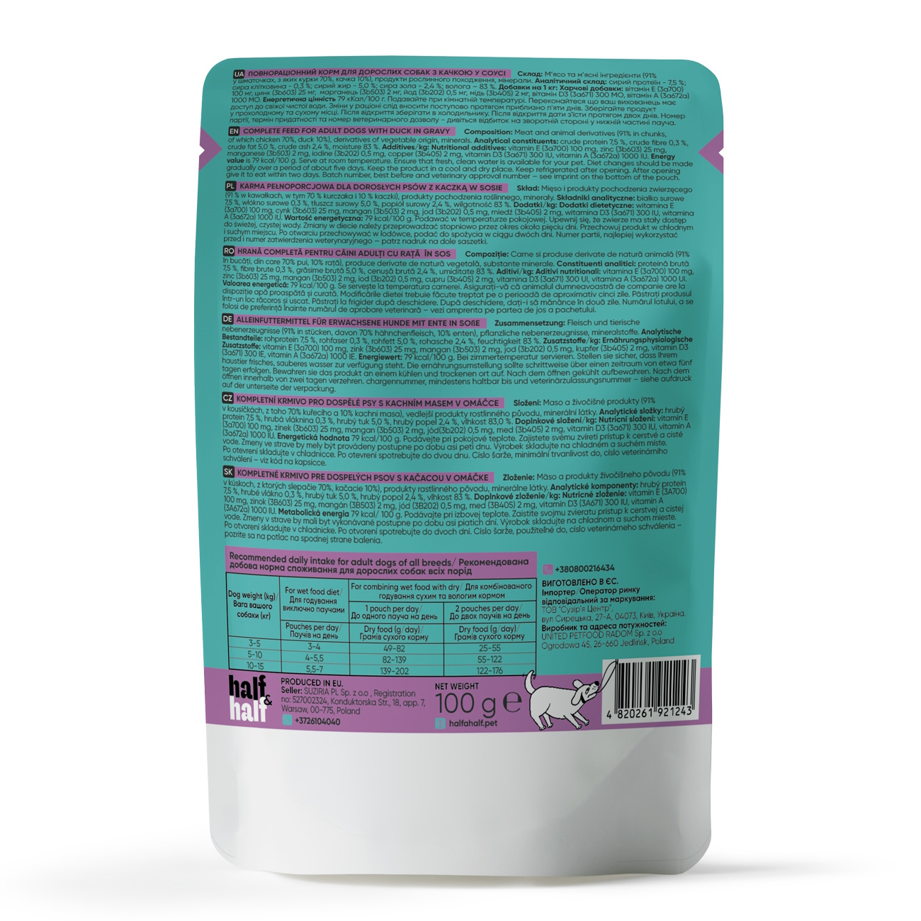 Повнораціонний вологий корм преміум класу, для дорослих собак. М’ясні шматочки з качкою в соусі.