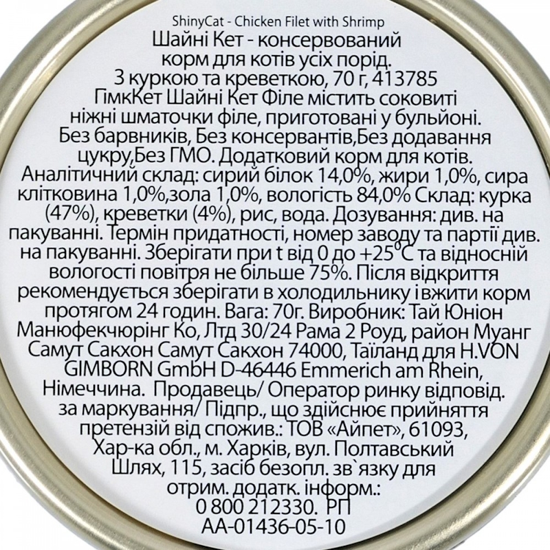 Shiny Cat Filet курка та креветки – це ніжні та соковиті шматочки м’яса курки та креветок, приготовані в бульйоні, з додаванням рису. Вологий корм суперпреміум класу для котів, збагачений протеїнами, не містить штучних барвників, ароматизаторів, підсилювачів смаку, генно модифікованих складових, консервантів.