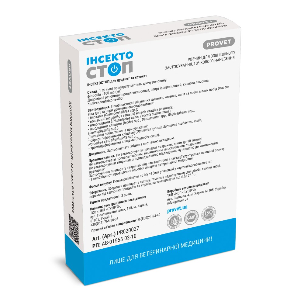 Форма випуску: полімерні піпетки об’ємом 0,5 мл, упаковані в картонні коробки по 6 штук. РП № АВ-01556-03-10.