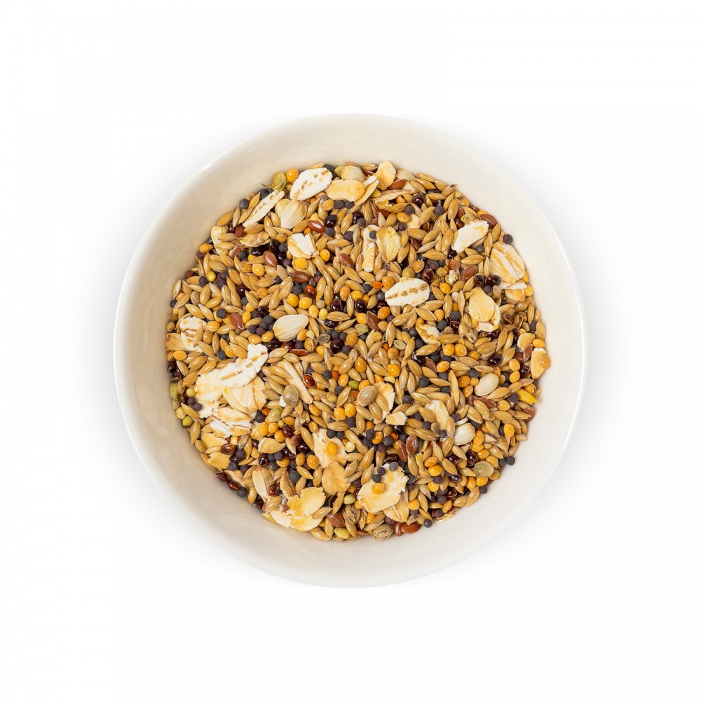 Склад: канаркове насіння, насіння конопель, насіння льону, вівсяні пластівці, арахіс, ріпак, чумиза, просо чорне, сафлор, просо жовте, сорго.