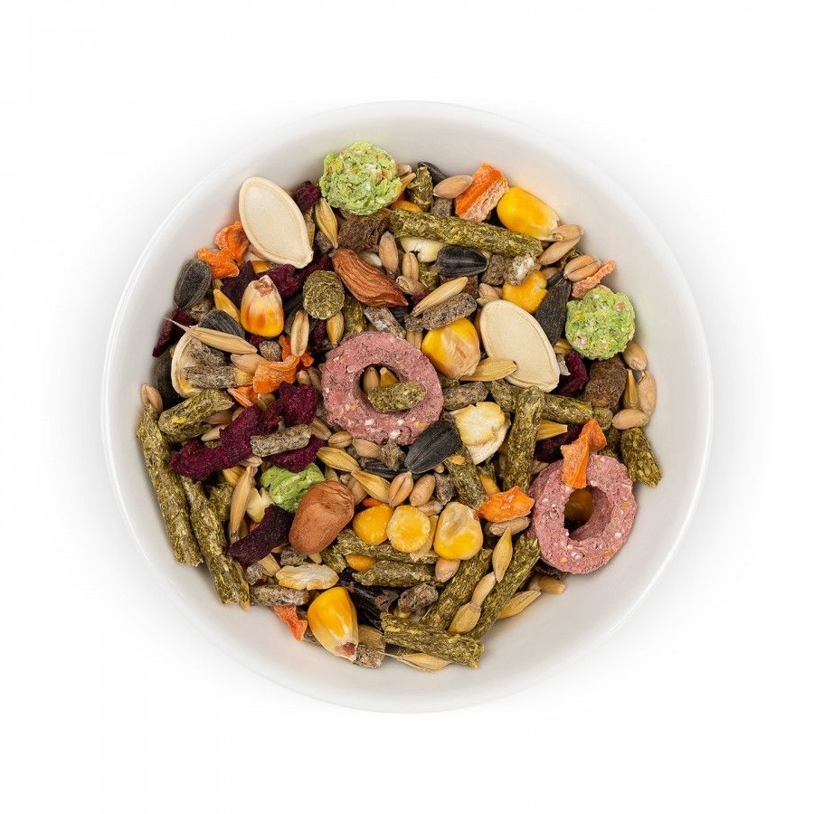 Склад: пшениця, овес, ячмінь, горіхи, кукурудза, горох плющений, злаково-овочевий гранулят (трав'яне борошно, буряк, злаки, макуха, висівки), насіння гарбуза і соняшника, гранульована трав'яна суміш (люцерна, лугові трави), зневоднені овочі і фрукти (морква, буряк, яблуко), спеціальний гранулят для гризунів (овес, пшениця, ячмінь, кукурудза, насіння гарбуза і льону, трав'яна мука, пшеничні висівки), ріжкове дерево (кероб).