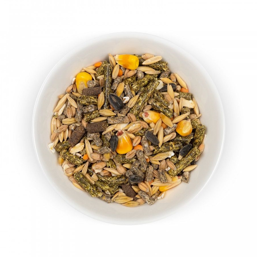 Склад:  яблука сушені гранульовані, трав’яне борошно гранульоване в асортименті, кукурудза, овес, ячмінь, комбікорм, вівсяні пластівці, насіння соняшнику, пшениця, сочевиця.