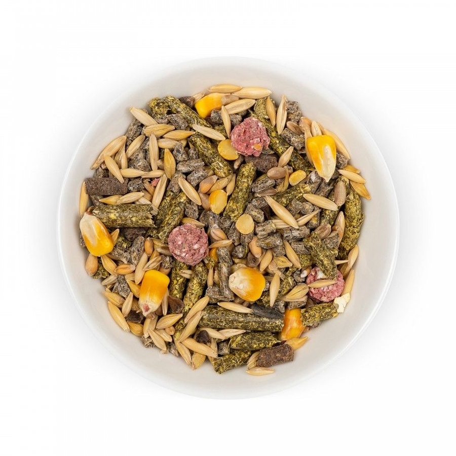 Склад: горохова крупа, комбікорм, кукурудза, овес, злаково-овочевий гранулят, насіння соняшнику, гречка, ячмінь, сушені яблука, пшениця, трав’яне борошно гранульоване в асортименті.