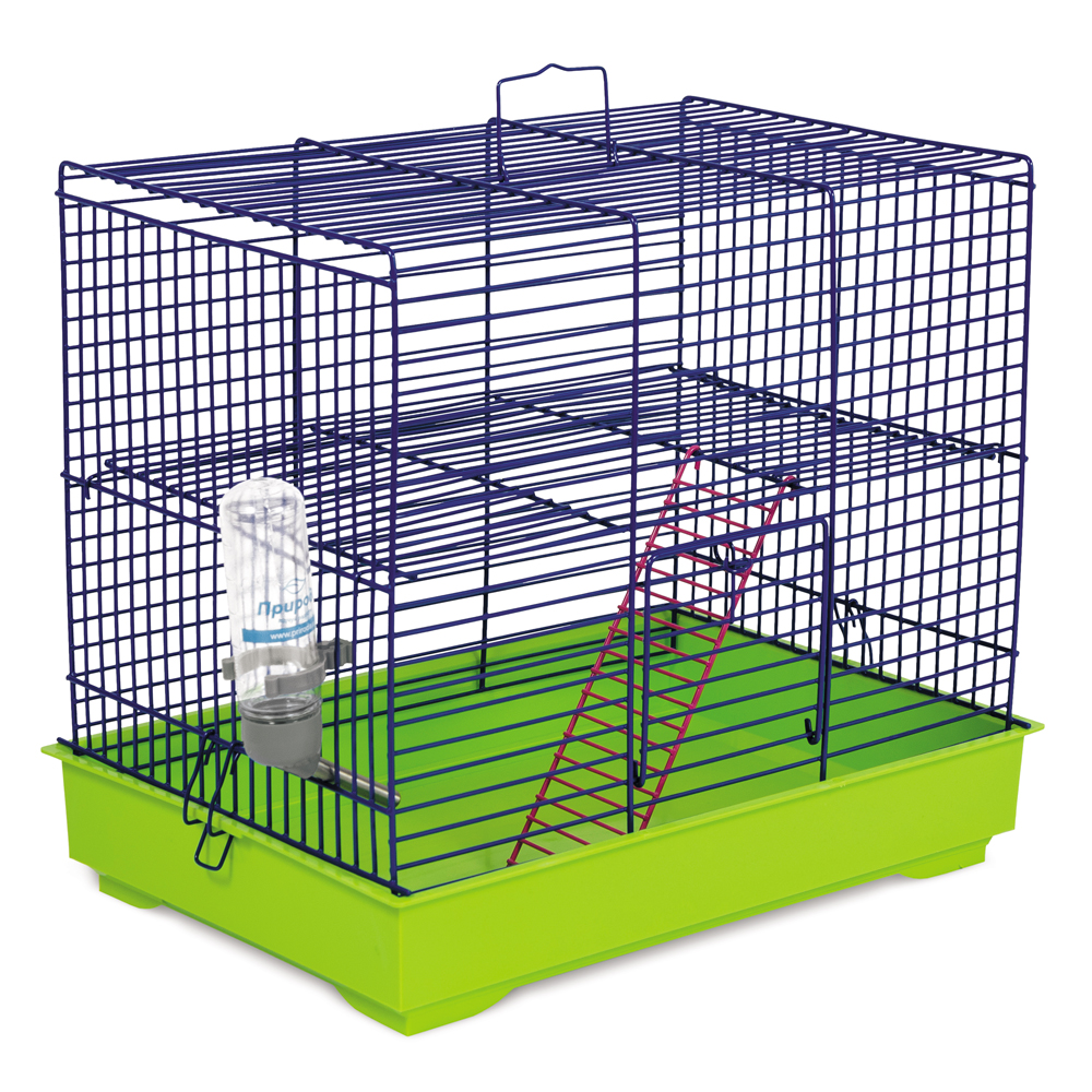 Клетка и «второй этаж» с лесенкой изготовлены из стальной проволоки, покрытой безопасной порошковой краской. Поддон из первичного полипропилена хорошо моется, прочный, без запаха. Клетка укомплектована поилкой.