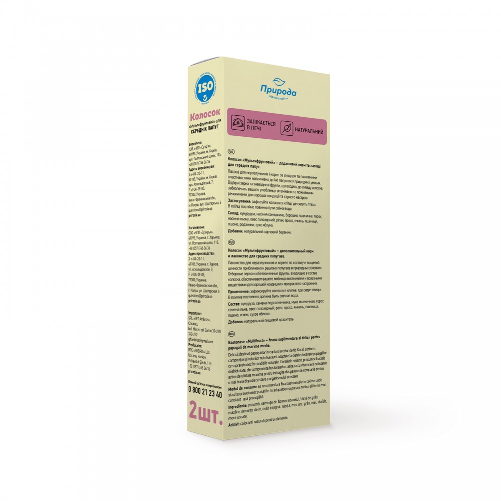 Колосок «Мультифруктовий» – повноцінний вітамінізований корм та ласощі для середніх папуг. Ласощі для нерозлучників і корел за складом та поживними властивостями наближено до їжі папужок у природних умовах. Відбірні зерна та зневоднені фрукти, що входять до складу колоска, забезпечать вашого улюбленця вітамінами та поживними речовинами для хорошої кондиції та гарного настрою.