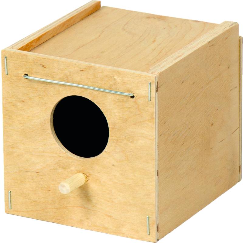 Будиночок для птахів виготовлений з фанери вищого сорту. Він надійно кріпиться із зовнішнього боку клітки, добре тримається і виглядає естетично. Матеріал не оброблявся токсичними речовинами - фарбами і лаками. Для комфорту пернатих улюбленців біля вічка прилаштована жердинка.