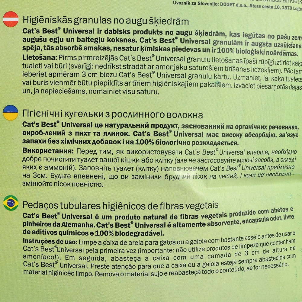 Описание: Cat’s Best Universal – це інноваційний деревний наповнювач для більшості домашніх улюбленців. Цей наповнювач не утворює грудочок. Cat’s Best Universal ідеальне рішення для власників, які мають кілька різних хатніх вихованців. Підходить для гризунів, птахів і котів. Виготовлений з 100% рослинних волокон, які пройшли термічну обробку.