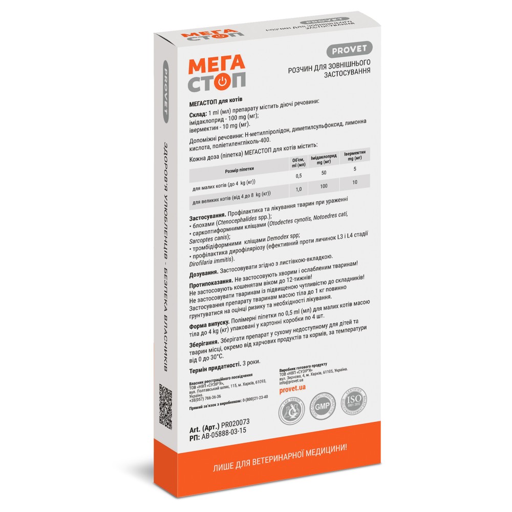 Описание: Препарат має високу ефективність до ектопаразитів, зокрема, бліх та кліщів (отодектозних, саркоптоїдних, нотоедрозних, демодекозних), і ендопаразитів: нематод, дирофілярій (ефективний проти личинок L3 і L4 стадії).