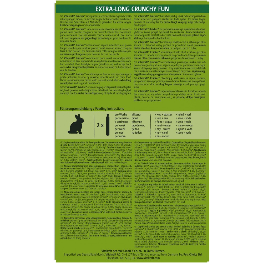 Крекер для кроликів з овочами, лісовими ягодами і горіхами - смачне та корисне доповнення до основного раціону вихованця. Ласощі є додатковим джерелом вітамінів і мінералів, та задовольняють потребу кроликів в сточуванні зубів. Виготовлений за унікальною технологією 3-х ступеневого запікання та не містить цукру. В упаковці 3 крекери.