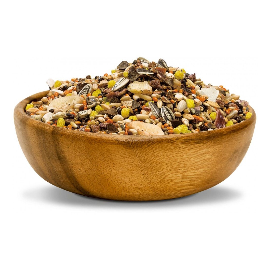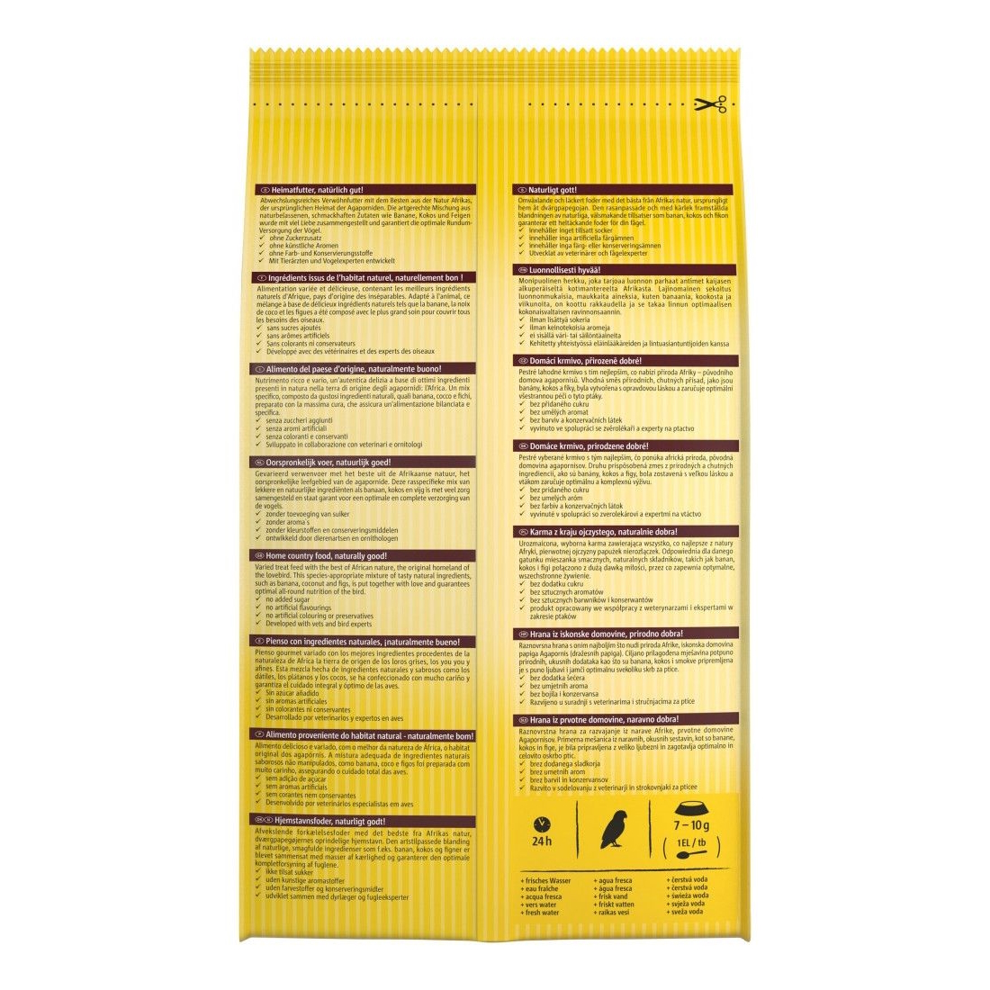 Склад корму відповідає раціону птаха у природному середовищі. Рекомендований для птахів родом з Африки, тому корм містить суміш таких інгредієнтів, як інжир, банан, кокос. Окрім основних інгредієнтів, корм містить вітаміни й інші поживні речовини, які необхідні птахам для здорового способу життя.