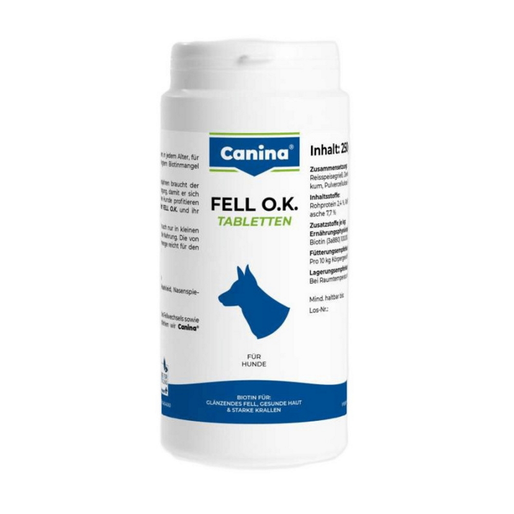 Таблетки Fell O. K. (250 г) содержат суточную норму биотина и некоторых важных витаминов для собак любого возраста и породы. Специалисты немецкого бренда Canina позаботились о том, чтобы компоненты быстро и просто усваивалась организмом животного.