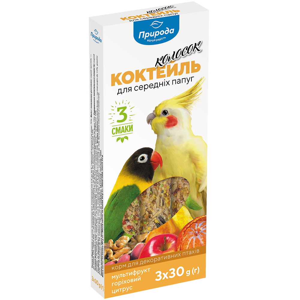 Склад: насіння льону, овес голозерний, ріпак, просо, ячмінь, пшениця, сушені яблука, сушені апельсини, сафлор, сушений виноград, насіння соняшнику, горохова крупа, рис, арахіс, пшоно