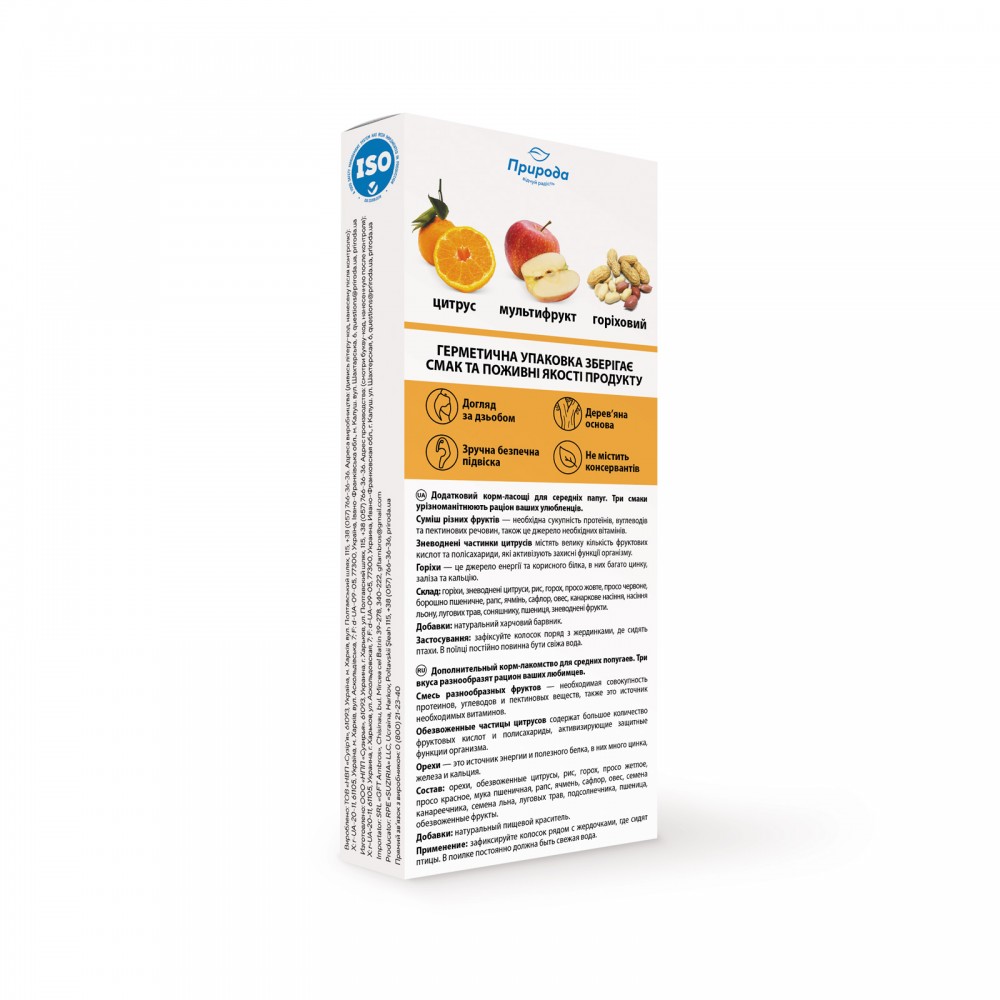 Горіхи - це джерело енергії і корисного білка, в них багато цинку, заліза і кальцію, тому це незамінна частина раціону птахів, вони сприяють нормальному обміну речовин і зміцненню імунітету. Зневодненні частки цитрусів містять велику кількість фруктових кислот і полісахариди. Полісахариди в складі цитрусових активізують захисні функції організму, попереджають інфекційні захворювання.