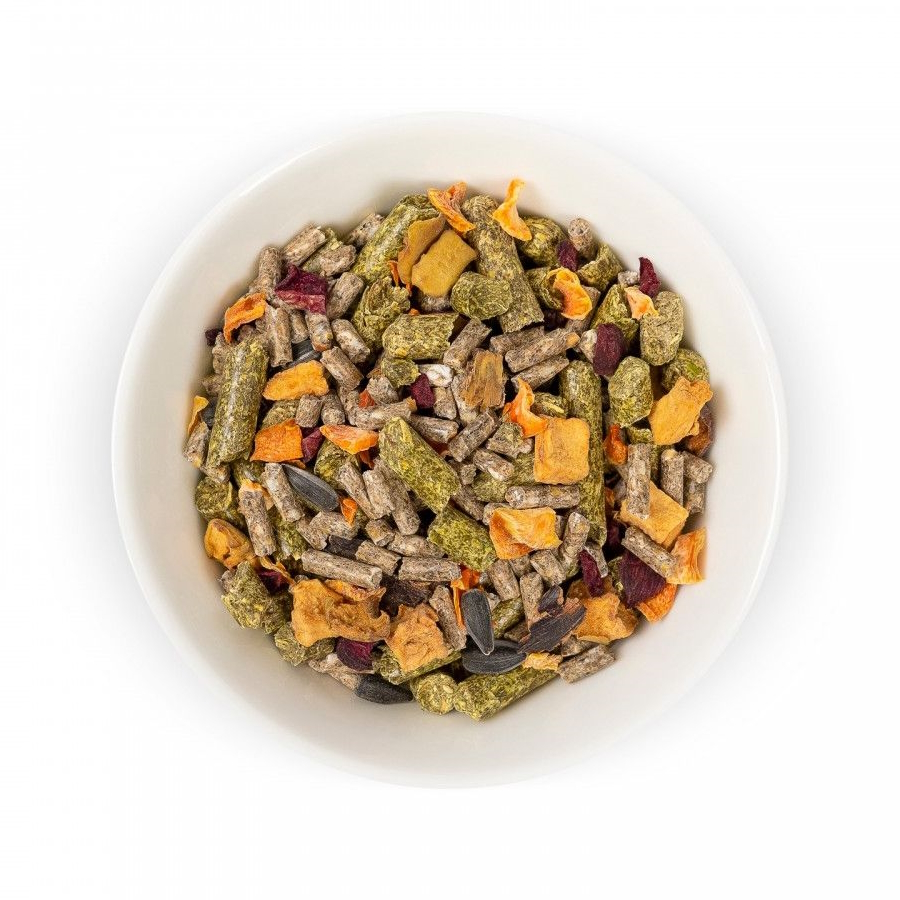 Базова суміш гранулятів доповнена сухими овочами, фруктами, керобом. Сучасна технологія виробництва гранулятів дозволяє максимально зберегти всі вітаміни та корисні речовини: білки, вуглеводи, антиоксиданти, пектини, незамінні амінокислоти, макро- та мікроелементи. Гранулят можна використовувати як основний корм чи корисне додавання до базового раціону. Тверді гранули дозволяють гризунам сточувати зуби.